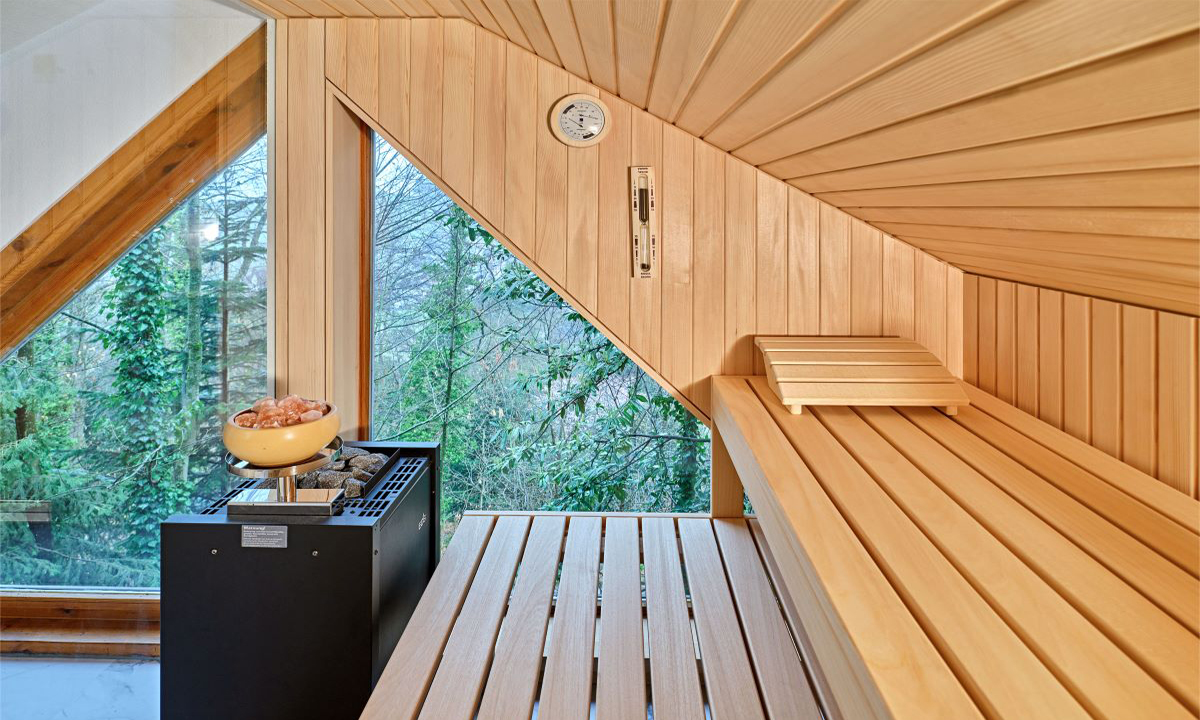 Eine Innensauna mit großen Glasflächen